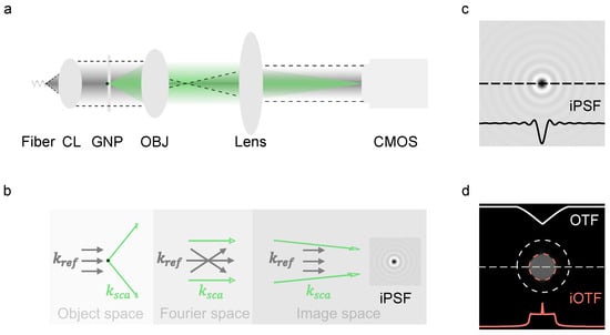 COBRI setup of wave vectors in the spatial space and images in the spatial and frequency domains: (a) Experimental setup based on a collimated fiber-coupling Light-Emitting Diode (LED) light source (CL, collimation lens; OBJ, objective; CMOS, Complementary Metal Oxide Semiconductor camera). The scattering light is marked with a green color and a continuous edge, and the reference light with a gray color and a dashed edge. The sample is GNPs of 20 nm in diameter. (b) Wave vectors in k-space correspond to (a); _ref is the reference light wave vector illuminated from the LED light source, marked with gray arrows; _sca is the scattering light wave vector from GNPs, marked with green arrows. The green arrows in the object space also represent the boundary of resolution governed by numerical aperture (NA). (c) The iPSF is generated from the interference of those wave vectors shown in (b). The solid line in dark is the cross-section intensity profile of the iPSF. (d) The corresponding iOTF to (c). The dashed circle in white represents the OTF boundary, which is mainly determined by NA. The upside of the solid curve in white is the cross-section intensity (log) of OTF. The dashed circle in red represents the iOTF boundary, which is governed not only by NA but also by the reference light. The downside of the solid curve in red is the cross-section intensity (log) of iOTF.