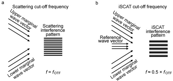 Different cut-off frequencies between pure scattering imaging and iSCAT imaging: (a) Scattering cut-off frequency equals to the OTF boundary. The scattering interference pattern approaching the diffraction limit. (b) Interferometric cut-off frequency is about half of the OTF boundary. The cut-off frequency is determined by the interference of marginal wave vectors and the reference wave vector; the interference angle is half of that in (a), resulting in the scattering interference pattern approaching half of the diffraction limit.