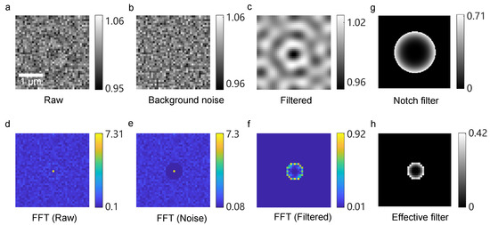 It should be emphasized that the central spot observed in Figure 3d,e corresponds to a constant intensity component in the spatial domain (Figure 3a,b), primarily arising from the reference light. As mentioned before, the contrast of the nanoparticle demonstrates an inverse relationship with the intensity of the reference light. To address this, we reweight the frequency components to compensate for aperture attenuation, thereby suppressing the reference light, as shown in Figure 3f and enhancing the bright–dark ring feature, as shown in Figure 3c. The reweighting filter is designed based on a Gaussian-shaped OTF aperture attenuation model, where higher-frequency components are amplified while lower-frequency components are attenuated, resulting in a balanced frequency distribution. A notch filter (Figure 3g) is introduced to reweight the frequency components, and a low-pass filter (Figure 3h) determined by the iOTF cut-off frequency is applied to extract noise as explained in Figure S2. The effective filter is the multiple result of the reweighting notch filter and the low-pass filter, as shown in Figure S3. The intensities in pixels of an image will not be increased but decrease with the effective filter applied. To compensate this kind of intensity decrease, a compensation parameter was introduced resulting a compensated image as in Figure S3f. The optimal compensation parameter was determined by reaching the highest structure similarity index measure (SSIM) score with the ground truth, as we noted in the source code.