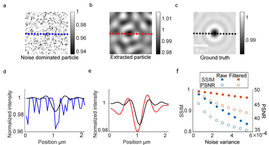 Simulation comparison of a single particle in the noise-dominated and the filtered image: (a) An iPSF modeled particle with Gaussian noise under simulation. (b) The extracted particle from (a). (c) The simulated iPSF was taken as the ground truth. (d) The cutline intensity profile along the dashed blue line in (a). (e) The cutline intensity profile along the red dotted line in (b). An intensity profile along the dashed line in (c) was presented in black solid line in (d,e) as the ground truth intensity. The blue solid line in (d) represents the intensity alone the blue dotted line in (a); the red solid line in (e) represents the intensity alone the red dotted line in (b). (f) The SSIM and PSNR values vary with the noise level both in the noise-dominated image in (a) and the filtered image in (b).