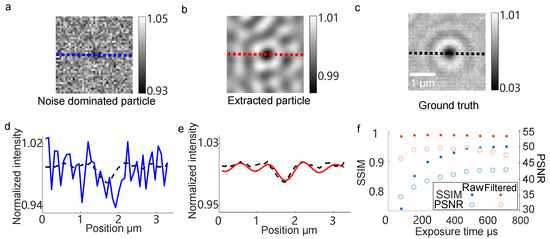 Experimental comparison between the raw image and the noise-dominated image: (a) A particle in the noise-dominated image captured under an exposure time of 80 s. (b) The same particle in the filtered image. (c) The particle from averaged frames was taken as the ground truth. (d) The cutline intensity profile along the dashed blue line in (a). (e) The cutline intensity profile along the dashed red line in (b). An intensity profile along the dashed line in (c) is presented in black dotted line in (d,e) as the ground truth intensity. The blue solid line in (d) represents the intensity alone the blue dotted line in (a); the red solid line in (e) represents the intensity alone the red dotted line in (b). (f) The SSIM and PSNR values vary with the exposure time, both in the noise-dominated image and the filtered image.