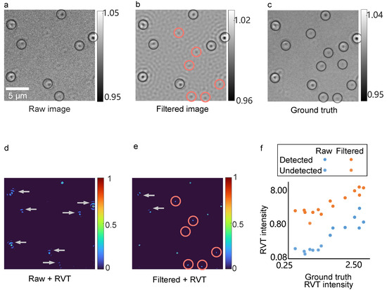 It is found that particles with contrast lower than 0.0133 are under noise and remain undetected in the noise-dominated image, as shown in Figure 6a. Meanwhile, the bright–dark rings feature has been enhanced, as shown in Figure 6b, resulting in the successful detection of those previously undetected particles, which are labeled in red circles in Figure 6b. The ground truth image in Figure 6c was obtained by averaging 100 static frames. The corresponding -restrained RVT images of Figure 5a and Figure 6b are as shown in Figure 6d,e. There exist side lobes (marked with gray arrows) around particles in the RVT result of the filtered image in Figure 6d, which were extinguished except for 2 particles of 13 in Figure 6e. Side lobes might introduce errors in the particle’s tracking and localization. Statistically, it shows an improved peak intensity after RVT, as shown in Figure 6d compared with that in Figure 6c. As a result, our approach shows high detection sensitivity to noise-dominated particles even in a single frame with an exposure time of less than 100 s.