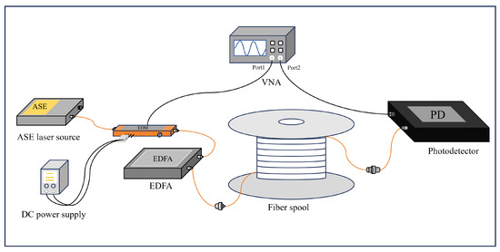 The hardware configuration for both the dispersion-induced power simulation model and the experimental setup is illustrated in Figure 1. An ASE source was employed that delivers a broadband optical carrier spanning 1528–1563 nm and an output power of 3.9 dBm. This ensured sufficient optical energy for modulation while avoiding saturation in subsequent amplification stages. The optical carrier was intensity-modulated by a 10 GHz bandwidth electro-optical modulator (EOM) driven from port 1 of a vector network analyzer (VNA, Rohde & Schwarz ZNL14) at a microwave frequency from 5 kHz to 10 GHz. After modulation, the optical signal was boosted by an erbium-doped fiber amplifier (EDFA) operating at a 21 dB gain and clamped to a 10 dBm output. Thereby, the power launched into the fiber was normalized to 10 dBm for consistent measurements across different fiber lengths. The transfer path consisted of single-mode fiber spools (SMF28, YOSC) of different lengths, with the lengths being 0 m, 60 m, 1 km, and 10 km respectively. It had an attenuation coefficient of 0.19 dB/km and a dispersion of approximately 17 ps/(nm·km) at 1550 nm. At the receiver, a high-speed photodetector (PD) with a 10 GHz bandwidth and 0.85 A/W responsivity converted the optical signals into the electrical domain. The microwave signal was fed back to port 2 of the VNA. The system parameter settings remained unchanged in each group of experiments: the ASE output power, modulation index, launched power, were applied consistently in both the simulations and experiments, ensuring the credibility of the experimental results and enabling precise evaluation of ranging performance as a function of fiber length. It is worth noting that the initial powers of the signals in the simulation model and experimental measurement were different. The initial power of the simulation model was 0 dBm, while that of the experimental measurement signal was 10 dBm.