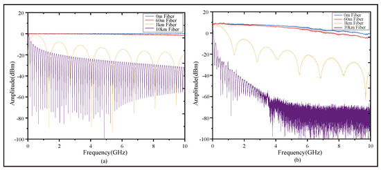 is the amplitude function, is the initial power considering fiber loss and gain (in ), and N is the number of wavelength sampling points. is the wavelength. and represent the upper and lower sidebands, respectively. Considering the fiber dispersion parameter D, length z, and group velocity , the phase term introduced by each wavelength component can be expressed as follows: