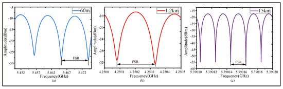 Measurement results of FSR corresponding to FUTs with different lengths in different frequency ranges. (a) FSR when FUT is a fiber 60 m in length. (b) FSR when FUT is a fiber 1.2 km in length. (c) FSR when FUT is a fiber 15 km in length.