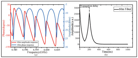 The measurement results of the system when the FUT is 60 m long. (a) The A-F and P-F response, in the form of dual Y-axis graph, of the 60 m long fiber. (b) The time-domain response propagation delay derived by the IFFT method.