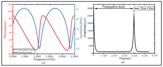 The measurement results of the system when the FUT is 1.2 km long. (a) The A-F and P-F response, in the form of a dual Y-axis graph, of the 1.2 km long fiber. (b) The time-domain response propagation delay derived by the IFFT method.