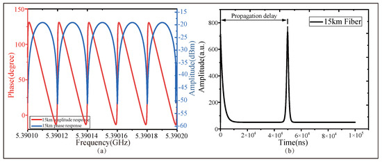 The measurement results of the system when the FUT is 15 km long. (a) The A-F and P-F response, in the form of dual Y-axis graph, of the 15 km long fiber. (b) The time-domain response propagation delay derived by the IFFT method.