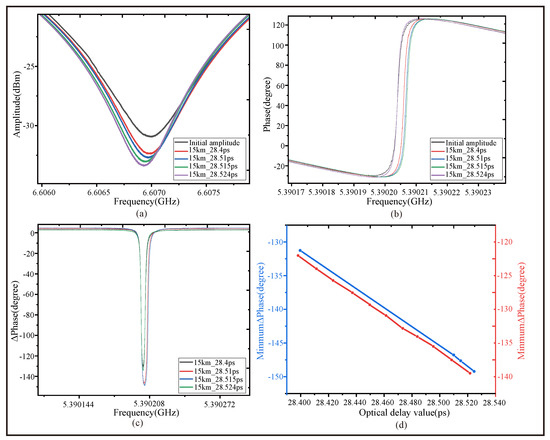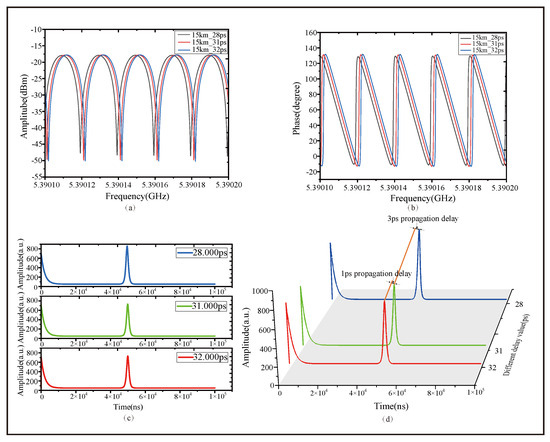 Figure 9a,b show the A-F characteristics and P-F characteristics near the destructive interference points. From the interference fringes, it can be clearly observed that near the destructive interference points, the frequency shift of the A-F characteristics and P-F characteristics changes with an increase in the introduced transfer delay. As shown in Figure 9c, refers to the phase change at the position of destructive interference. This indicates that changes with the delay value, and the phase can be quantitatively determined using techniques such as PSA. The PSA method achieves high-precision distance measurement and minimal displacement determination by detecting extremely small phase changes, which are amplified into more obvious intensity or frequency responses in the interference output. Meanwhile, Figure 9d reveals the linear relationship between and its corresponding delay value. Since the corresponding experiment is based on data from the same group of experiments, we conducted more repetitive experiments to verify its linear relationship more thoroughly. This demonstrated the capability of the proposed OCMI system to achieve PSA for applications such as phase measurement and minimal distance determination. Using the PSA method to process data can resolve FTD changes on the order of ps. After applying the PSA method, minimal displacements could be distinguished.