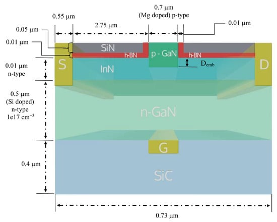 −3. On top of the GaN layer lies a 10 nm thick InN channel layer, which supports high-mobility electron transport and efficient 2DEG formation. The device employs a dual-layer passivation scheme consisting of a SiN top layer and an h-BN interlayer, within which a 0.06 μm thick, 0.7 μm wide p-type GaN region is embedded. This p-GaN region, doped with Mg at around