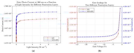 To investigate the effect of gate passivation on both optical responsivity and leakage current suppression, two device variants were simulated with identical structural and doping parameters. The first configuration employed a conventional single-layer SiN passivation of 60 nm thickness, while the second replaced the lower 10 nm portion of the SiN layer with h-BN, forming a conformal interface across the central region and along the vertical sidewalls of the embedded p-GaN as illustrated in