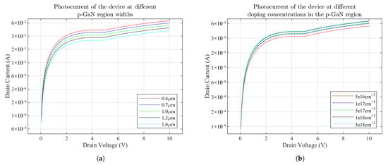 Figure 5a shows that narrower p-GaN widths increase photocurrent due to reduced channel depletion, whereas excessively wide regions inhibit carrier transport. Conversely, increasing Mg doping concentration enhances the internal electric field, leading to stronger 2DEG modulation and improved photoresponse (
