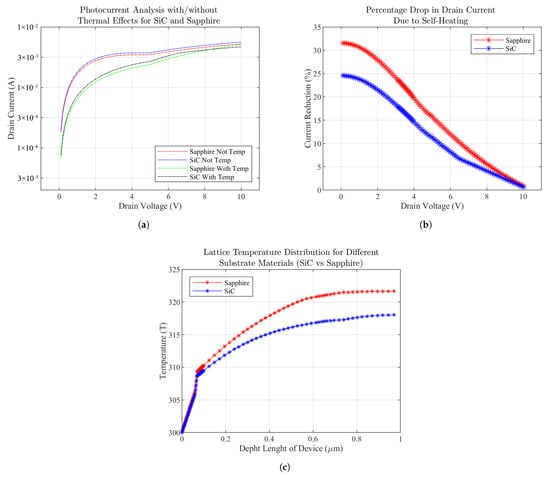 To assess the thermal robustness of the proposed UV photodetector, a comparative simulation was conducted for two substrate materials: silicon carbide (SiC) and sapphire. Simulations were performed under both idealized non-thermal conditions and realistic self-heating scenarios at an ambient temperature of 300 K.
