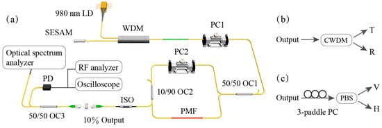 The architecture of the laser constructed in this work is shown in Figure 1a. The pump source is a laser diode operating at a center wavelength of 976 nm and a maximum output power of 400 mW. The pump source and the reflection-type packaged SESAM (BATOP, SAM-1550-17-1.5ps, Jena, Germany) are coupled into the cavity through a 980/1550 nm WDM, which is connected to the Sagnac loop via a 60 cm-long EDF (LIEKKI, Er110-4/125, Camas, WA, USA). A polarization controller (PC1) is used in the optical path to adjust the polarization state of the light wave before it enters the Sagnac loop. The Sagnac loop consists of a 50/50 optical coupler (OC1), a 45 cm-long PMF (Corning, PM 1550, Corning, NY, USA) with birefringence of ~3.9 × 10−4, another polarization controller (PC2), and a 10/90 optical coupler (OC2), where the 10/90 OC2 is responsible for outputting 10% of the cavity energy.