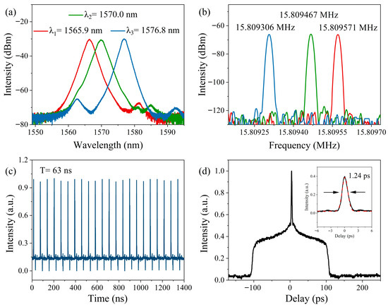 Figure 2 shows the output characteristics of single-pulse sequence at three representative wavelengths. As shown in Figure 2a, the center wavelengths of the typical optical spectra are at λ1 = 1565.9 nm, λ2 = 1570.0 nm, and λ3 = 1576.8 nm, with −3 dB bandwidths of 2.07 nm, 2.14 nm, and 1.70 nm, respectively. The −3 dB bandwidth represents the frequency range where the signal power is reduced to half of its maximum value, and a signal within this range is considered to have sufficient energy and intensity. Figure 2b presents the corresponding RF spectra of the typical optical spectra, where the repetition rates corresponding to λ1, λ2, and λ3 are 15.809571 MHz, 15.809467 MHz, and 15.809306 MHz, respectively. The length of the laser cavity in this work is 12.65 m. Based on the formula , it can be determined that the laser is operating in the mode-locking state of fundamental frequency. From Figure 2b, it can be observed that the repetition rate of the mode-locked pulses decreases as the center wavelength increases. This phenomenon is attributed to the laser operation in the negative dispersion regime, where the group velocity of the light with longer-wavelength is lower than that of the light with shorter-wavelength. Figure 2c,d show the corresponding pulse train and the autocorrelation trace when the center wavelength of the mode-locked pulses is at λ2. From Figure 2c, it can be seen that the pulse train has a period of 63 ns, corresponding to the time of a pulse propagating in the laser cavity for a round trip, indicating that it is mode-locked at the fundamental mode-locking frequency. The autocorrelation trace of the output pulses shown in Figure 2d features a narrow spike sitting on a picosecond-scale pedestal. The double-scale autocorrelation trace together with the smooth spectrum indicates that the output corresponds to NLPs. The width of the pedestal characterizes the duration of the NLP wave packet. In this state, as the pump power increases, the top of the pedestal gradually flattens, which can be attributed to the further broadening of the NLP wave packet such that more portions extend beyond the scanning range of the autocorrelator.