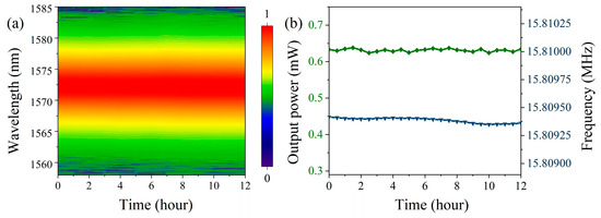 We further investigated the stability of the laser in the single-pulse mode-locked state. Figure 3 shows the variations in the laser’s spectrum, output power, and repetition rate during 12 h of continuous operation in this mode-locked state. As shown in Figure 3, the output spectrum and power of the laser remained essentially unchanged during the 12-h operation, demonstrating good stability. The maximum drift of the repetition rate during this period was 66 Hz, which we speculate is primarily caused by changes in the environmental temperature.