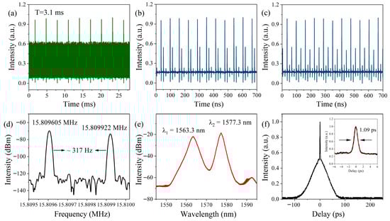 When the pump power is at 120 mW, the laser can achieve mode-locking with asynchronous pulse sequence generation, by carefully adjusting the PCs, and the mode-locking state can be maintained until the pump power is increased to 250 mW. Figure 4 shows output characteristics recorded with the pump power at 160 mW, where the output power is 1.40 mW. The pulse interference pattern with a period of 3.1 ms in Figure 4a indicates that the laser generates asynchronous pulse sequences. Setting the time window of the oscilloscope to 700 ns, two sets of pulse sequences with different amplitudes can be clearly observed. As shown in Figure 4b,c, the time intervals between the two sets of pulses vary at different moments, further demonstrating the asynchronous nature of the two pulse trains. Figure 4d,e show the RF spectra and optical spectra of the asynchronous pulse sequences, respectively. As shown in Figure 4d, the RF spectrum exhibits a distinct double-peak feature, with the peaks located at 15.809605 MHz and 15.809922 MHz, respectively, indicating a repetition rate difference of 317 Hz between the two pulse sequences. This frequency difference corresponds to the reciprocal of the pulse interference period shown in Figure 4a, with a slight deviation mainly due to the limited resolution of the RF analyzer. The optical spectrum shown in Figure 4e has two distinct center wavelengths, located at 1563.3 nm and 1577.3 nm, with −3 dB bandwidths of 2.3 nm and 1.5 nm, respectively. The wavelength separation between the two mode-locking centers is 14 nm, corresponding to the FSR of the transmission spectrum of the Sagnac loop. From the experimental observation presented above, it can be inferred that the mechanism of the asynchronous pulse sequence generation is based on wavelength-multiplexing with the Sagnac loop filtering effect. From the relationship between the center wavelength of the pulse sequence and repetition rate discussed in Section 3.1, it can be concluded that the pulse sequence with the center wavelength at λ1 has the repetition rate of 15.809922 MHz, while the pulse sequence with the center wavelength of λ2 has the repetition rate of 15.809605 MHz. Finally, the autocorrelation trace shown in Figure 4f indicates that the pulse is noise-like, and fitting with Gaussian yields a spike width of 1.09 ps.