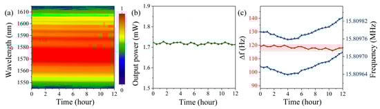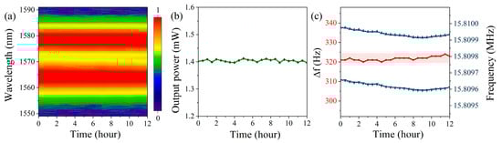 We measured the stability of the laser in the wavelength-multiplexing asynchronous mode-locked state. Figure 5 shows the variations in the spectrum, output power, repetition rate, and repetition rate difference of the laser during 12 h of continuous operation in this mode-locked state. As shown in Figure 5a,b, the output spectrum and power exhibited no significant changes during the 12-h operation, demonstrating good stability. As illustrated in Figure 5c, the repetition rates of the two asynchronous pulse sequences each experienced a maximum drift of about 60 Hz; however, in the absence of any external modulation devices, the maximum drift of their repetition rate difference remained within 4 Hz. This result indicates that the inherent common-cavity effect of the single-cavity dual-comb system can effectively suppress the influence of environmental perturbations on the repetition rate difference between the two combs, thus providing important assurance for the stability and reliability of dual-comb light sources.