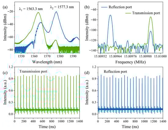 As shown in Figure 6a, the green curve represents the optical spectrum measured from the transmission port of the CWDM while the blue curve shows the optical spectrum measured from the reflection port of the CWDM. After passing through the CWDM, the two pulse sequences are basically separated. The slight overlap of the two spectra is due to the insufficient isolation between the two output ports of the CWDM. Figure 6b shows the RF spectra measured from the two output ports of the CWDM. From the RF spectrum, it can be seen that the pulse sequence with the center wavelength of λ2 is completely filtered out at the transmission output port, while a portion of the pulse sequence with the center wavelength of λ1 still remains at the reflection output port. At the reflection port, the signal-to-noise ratio (SNR) of the pulse sequence with the center wavelength of λ2 is significantly higher than that of λ1, with an SNR difference of more than 30 dB. Therefore, the pulse sequence with the higher repetition rate from the reflection output can be regarded as noise. Figure 6c and Figure 6d show the pulse sequences measured from the transmission and reflection output ports of the CWDM, respectively. As illustrated, the asynchronous pulse sequences generated in the laser cavity can be successfully separated with the CWDM, further confirming that the generation of the asynchronous pulse sequences is wavelength-multiplexing based. Specifically, this is accomplished by leveraging the interference effect of the Sagnac loop to create varying transmissivity for light waves of different wavelengths, thereby forming a filtering effect and realizing wavelength-multiplexing generation of the asynchronous pulse sequences.