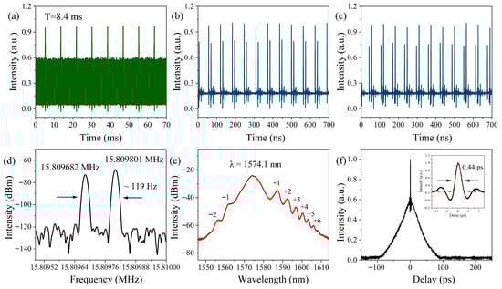 When the pump power is set to 190 mW, a pulse interference pattern with a larger fringe spacing than before is observed during the adjustment of the PCs. At this point, the output power of the laser is 1.72 mW. As shown in Figure 7a, the pulse interference period now is 8.4 ms. Together with the two sets of pulse sequences observed at different moments shown in Figure 7b,c, the results indicate that the laser now generates asynchronous pulse sequences with a different repetition rate difference than before. From the RF spectrum in Figure 7d, the repetition rates of the two pulse sequences in this state are determined to be 15.809628 MHz and 15.809801 MHz, respectively, corresponding to a repetition rate difference of 119 Hz, which is significantly smaller than the previous value of 317 Hz. Figure 7e displays the optical spectrum of the laser output with the center wavelength of 1574.1 nm and the −3 dB bandwidth of 5.3 nm. The optical spectrum exhibits a pronounced feature of the asymmetric sidebands, a phenomenon commonly observed in single-wavelength mode-locked pulse sequences in previous studies [26,27,28,29]. Our experiments demonstrate that the phenomenon of asymmetric spectral sidebands can also appear in asynchronous pulse sequences. Based on the spectral characteristics, it is inferred that the generation of asynchronous pulse sequences has transitioned from wavelength-multiplexing to other mechanisms. The autocorrelation trace in Figure 7f indicates that the pulse sequence in this state still consists of NLPs.