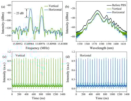 The RF spectrum after PBS separation is shown in Figure 9a. In Figure 9a, the polarization extinction ratio of the two pulses is approximately 23 dB, indicating that the two pulse sequences are nearly orthogonally polarized to each other. This confirms that the generation of the asynchronous pulse sequences in the laser now is due to polarization-multiplexing [14,16]. Figure 9b shows the optical spectra of the pulse sequences after the PBS. As illustrated, the spectra measured from the vertical and horizontal polarization ports of the PBS exhibit similar shapes, with center wavelengths of 1573.9 nm and 1574.6 nm, respectively. Figure 9c,d show the pulse sequences measured with oscilloscope from the vertical and horizontal polarization ports of the PBS, respectively. Different from the pulse sequences separated by the CWDM with wavelength-multiplexing, a small amount of the other set of pulse sequences is still visible in the separated pulse sequences. This is because the two pulse sequences are not completely orthogonally polarized. The birefringence of the PMF inside the laser cavity leads to different refractive indices along different polarization directions. Combined with the meticulous adjustment of the PCs, this induces two sets of pulse sequences with distinct repetition rates in the orthogonal directions, which fundamentally explains the phenomenon of asynchronous pulse sequence output at this time.