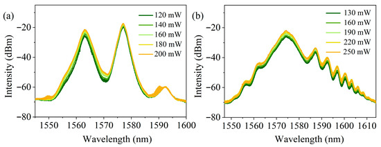 To investigate the key factor for switching between the two multiplexing mechanisms, we first studied the effect of pump power on the laser in the two mode-locked states. As shown in Figure 10a, in the wavelength-multiplexing mode-locked state, changing only the pump power from 120 to 200 mW led to an increase in spectral intensity, while the spectral shape remained essentially unchanged and the asynchronous mode-locking was maintained throughout. Similarly, in the polarization-multiplexing mode-locked state shown in Figure 10b, changing only the pump power from 130 to 250 mW also increased the spectral intensity without significantly altering the spectral shape, and the asynchronous mode-locking was preserved. These results indicate that variations in pump power are not the key factor for switching between the two multiplexing mechanisms.