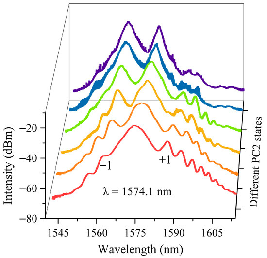 From the above experiments and numerical analysis, it can be seen that the red curve in Figure 11 corresponds to the spectrum in the polarization-multiplexing asynchronous mode-locked state, where the transmission peak of the Sagnac loop is located near the central mode-locking wavelength of λ = 1574.1 nm. Based on the birefringence of the PMF within the Sagnac loop, precise adjustment of the pump as well as PC1 and PC2 allows light to simultaneously oscillate along two orthogonal polarization directions in the cavity, ultimately forming polarization-multiplexing asynchronous pulse mode-locking. On this basis, adjusting PC2 alters the distribution of polarization states inside the laser cavity, causing the light to no longer satisfy the condition for simultaneous oscillation along the two orthogonal polarization directions. Concurrently, due to changes in phase and transmission, a dual-peak spectrum gradually forms, and the laser transitions from polarization-multiplexing asynchronous pulse mode-locking to wavelength-multiplexing asynchronous pulse mode-locking. The purple curve in Figure 11 represents the optical spectrum under the wavelength-multiplexing asynchronous mode-locking state. However, this asynchronous mode-locking state is unstable at this point. Through precise control of the pump power and PCs, a stable wavelength-multiplexing asynchronous mode-locking state, as shown in Figure 4, can ultimately be achieved. In summary, the adjustment of PC2 within the laser is a key factor for switching between wavelength- and polarization-multiplexing asynchronous pulse sequences, but obtaining stable asynchronous pulse mode-locking still requires a combination of precise control of the pump and PC1.