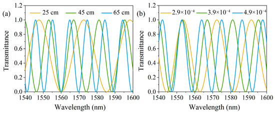 To further analyze the mechanism underlying the switching between two multiplexing modes in the constructed laser, we perform a numerical simulation of the transmission curve of the Sagnac loop. Based on Equation (1), , presented in Section 2, which considers only the filtering effect of the Sagnac loop, it can be concluded that the maximum transmission is achieved when (k is an integer). At this condition, the FSR of the Sagnac loop transmission curve is jointly determined by the length of the PMF within the loop and its birefringence. As shown in Figure 12a,b, the FSR of the transmission curve decreases with increasing PMF length or birefringence.