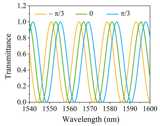 Here represents the additional phase delay introduced by PC2. As shown in Figure 13, the additional phase delay caused by PC2 shifts the transmission curve, thereby altering the position of the transmission peaks. This is the primary reason for the experimentally observed blue shift in the spectrum when adjusting PC2. In practical operation, adjusting PC2 changes the polarization state distribution within the laser cavity. This process not only introduces an extra phase delay that modifies the transmission of the Sagnac loop but also affects whether stable pulses can form along different polarization directions inside the cavity.