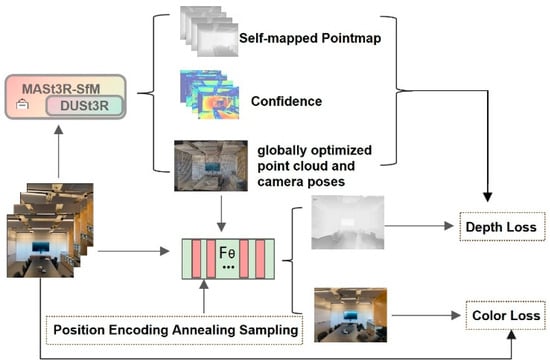Overall Workflow Diagram of SparsePose–NeRF. Our method first utilizes the MASt3R-SfM frontend to robustly estimate camera poses from sparse input views while simultaneously generating an initial self-mapped point map and a final globally optimized point cloud. This geometric prior information is used to construct a two-stage depth loss. Concurrently, the NeRF network (FΘ) is trained using a position encoding annealing sampling strategy. Finally, the network is optimized by combining the depth loss and the traditional color loss to achieve high-quality reconstruction.