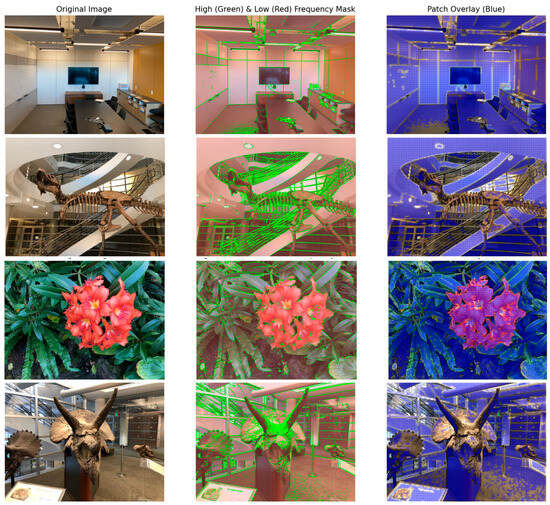 In practice, the Sobel operator computes horizontal (Gx) and vertical (Gy) gradients, which are combined to obtain the gradient magnitude Gmag for each pixel. To clearly illustrate the processing procedure, we visually illustrate the processing of high- and low-frequency information in images in Figure 2. We employed distinct color annotations to differentiate high-frequency and low-frequency regions in the results. Regions where the gradient fell below the defined threshold were designated as low-frequency zones, indicated in light red, whereas regions with gradients exceeding the threshold were labeled as high-frequency zones, depicted in dark green. In the early stages of network training, we implemented an annealing strategy for NeRF positional encoding, which limited the network’s ability to learn high-frequency features. As a result, during the initial phase of training, avoiding the selection of pixels in high-frequency regions for sampling rays proved to be both resource-efficient and beneficial for faster network convergence. Our approach involves continuously sampling multiple patches from each low-frequency region, with each patch sized at 32 × 32 pixels, encompassing a total of 1024 pixels per patch. To ensure comprehensive coverage, we maintain a 30% overlap between sampled regions. If a given region contains fewer than 1024 pixels in total, it is skipped entirely. Unlike the Vanilla NeRF strategy, which randomly shuffles all training set pixels and selects them randomly during the early stages of training, our method ensures that all sampled pixels are contained within the same batch.
