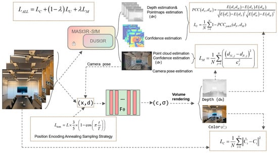 The input unconstrained images are first processed by the MASt3R-SfM network to compute camera poses, self-mapped point maps, confidence maps, and normalized point maps. The estimated camera poses are then passed to the NeRF network for ray sampling, where a position-encoded high-frequency quenching strategy is applied to prevent the network from overfitting to high-frequency information. During rendering, the depth maps generated by the NeRF network are compared with the precomputed depth values to construct the depth regularization loss functions LM and LU. Additionally, the RGB values rendered by the NeRF network are compared with the input images to formulate the color–space regularization loss function. The red, green, and blue lines denote the estimated camera poses generated by our model.