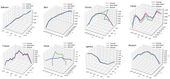 In the qualitative experiments, we utilized COLMAP to generate high-quality 3D reconstructions and camera pose estimations as ground truth. To evaluate the accuracy of our network’s camera pose estimation, we compared the camera trajectories generated by our method against those produced by the state-of-the-art pose-free NeRF algorithm, NoPe–NeRF, across eight selected scenarios. During the experiments, we applied the Procrustes alignment method to align and visualize the camera trajectories, as illustrated in Figure 4. From the visualized results, it can be observed that our proposed method performs well on complex datasets such as Tanks and Temples. For instance, in most scenes (e.g., Ballroom, Barn, Francis, and Museum), the trajectories reconstructed by MASt3R-SfM are highly consistent with those of COLMAP, demonstrating superior accuracy and robustness. This indicates that our method can reliably recover 3D trajectories in these scenarios. In contrast, NoPe–NeRF exhibits significant deviations or instability in certain scenes (e.g., Horse and Church), highlighting its limitations in handling complex or structurally unique environments, possibly due to constraints in its model capacity or algorithmic design. Moreover, in scenes with intricate structures and variations (e.g., Family and Church), MASt3R-SfM outperforms NoPe–NeRF by capturing finer details and maintaining alignment with COLMAP’s trajectories. Overall, these trajectory visualizations clearly illustrate the advantages of our algorithm in terms of camera pose estimation accuracy, stability, and adaptability to diverse scenes. However, the results also reveal that NoPe–NeRF requires further optimization to handle challenging scenarios effectively.