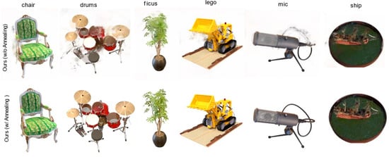 Qualitative ablation study of the high-frequency annealing strategy. On the NeRF-synthetic dataset, removing this strategy (top row) leads to severe overfitting, manifested as significant geometric “floaters” in empty space. Our full model (bottom row) successfully suppresses these artifacts, producing clean and sharp images.