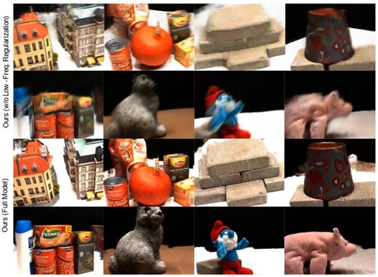 Our ablation study reveals that the low-frequency regularization strategy is critical for ensuring geometric stability and the final rendering quality. This is particularly evident in the qualitative results presented in Figure 8. The baseline model (top row), which omits this strategy, suffers from severe visual artifacts. Specifically, its rendered surfaces exhibit unnatural splotches of color and shading, an effect typically indicative of an incorrectly learned underlying 3D geometry. Furthermore, the boundaries between the object and the background are poorly defined, further evidencing defects in its geometric boundary reconstruction.