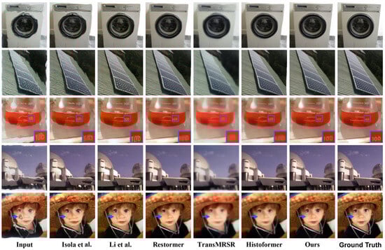 Comparison results. As the approaches of Tian et al., Oreifej et al., Halder et al., and James et al. [8,11,12,19] necessitate an image sequence input, image restoration evaluations could not be conducted on the LiSet. Initially, we compare the image restoration outcomes of Isola’s method, Li’s method, Restormer, TransMRSR, Histoformer, and our model based on the LiSet test dataset. Figure 5 presents a comparison of the image restoration results on the LiSet, with the first column displaying the captured perturbed degraded image as the model input. Subsequently, the seventh and eighth columns depict the results of the image restoration via our method and the actual image, and the second to sixth columns showcase the restoration outcomes utilizing other methods, respectively.