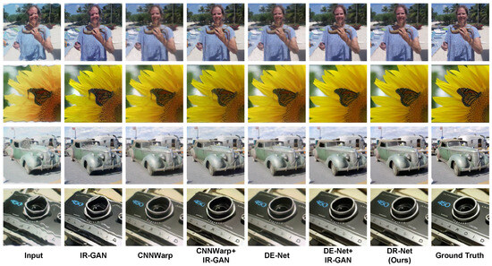 - The staged design of DR-Net enables targeted handling of distinct degradation factors: DE-Net focuses on distortion estimation and correction, while IR-GAN specializes in deblurring and detail recovery, effectively mitigating the cumulative artifacts introduced during sequential processing.