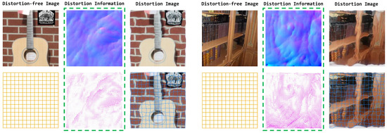 Visualization of distortion information estimated by DE-Net. From left to right of each group: distortion-free image (ground-truth), DE-Net-estimated distortion information, and the distorted input image (degraded image to be restored). The bottom row displays warped grids overlaid on the distorted images, where grid deformation (inferred from the estimated distortion) visualizes displacement patterns intuitively. This comparison demonstrates DE-Net’s ability to capture distortion characteristics from degraded inputs.