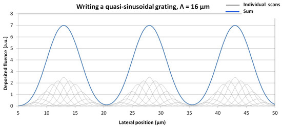 Total deposited fluence along a sinusoidal grating with a grating constant of 16 μm. The profile of the ion microbeam was approximated by Gaussian with a FWHM of 3 μm. Fluence distributions of the individual scans are represented by gray lines. Individual scans were separated by 1 μm. Sum of the deposited fluence distributions of the individual scans is represented by the blue line. This figure was originally published in [22].
