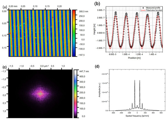 To reveal the nonlinearities of the ion-implanted gratings, the free Gwyddion program [29] was used to perform a two-dimensional Fourier transform (2-D FT) of the topography of the gratings. The modulus of the 2-D Fourier transform (FT) was calculated. Then relative amplitudes of the harmonics of the grating profile were determined by the analysis of the one-dimensional distribution of the modulus of the FT along the direction of the grating constant. The procedure is shown in Figure 3a–d.