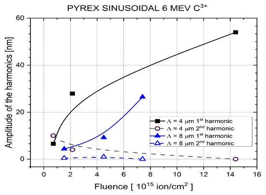 It must be noted that the highest implanted fluence used in these experiments was 1.44 × 1016 ion/cm2, when very fine (Λ = 4 μm) gratings were implanted in Pyrex glass by 6 MeV C3+ ions. In spite of the very high fluence, the amplitude of the first harmonic was only 54 nm, as can be seen in Figure 4.