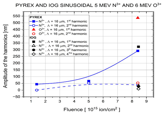 In Figure 5, there are three data points only for the first and second harmonics of the gratings implanted by 5 MeV N3+ ions in Pyrex glass. It is not easy to establish a trend of the change in nonlinearity with fluence, since the first-to-second-harmonic amplitude ratio significantly increases at the fluence of 5 × 1015 ion/cm2, due to the small increase in the 1st order harmonic amplitude. Then that ratio reaches an extremely high value of 12 at the highest implanted fluence of 8.45 × 1015 ion/cm2. That ratio at the same fluence is very similar (11) for the grating implanted by 6 MeV O4+ ions. This fact could suggest that the nonlinearity of the ion beam-implanted gratings is largely the same for the ion species used in these experiments.