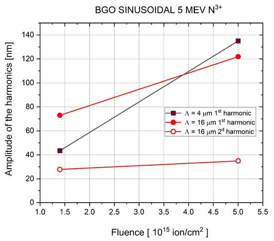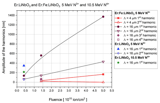 Although the amplitudes for only one grating implanted by 5 MeV N3+ ions in Er: LiNbO3 (also of Λ = 16 μm) are presented in Figure 8, these results are important. The amplitude of the 1st harmonic was 346 nm at a fluence of 4 × 1014 ion/cm2, very close to that obtained in Bi12GeO20 at the same fluence, but by 10.5 MeV N4+ ions, namely 398 nm.