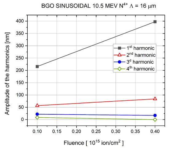 In general, amplitudes of the first and second harmonics of the gratings could be determined by the Fourier analysis, as can be seen in Figure 4, Figure 5, Figure 6, Figure 7 and Figure 8. A complete set of amplitudes of all the orders up to the 4th can be found only in Figure 7, where harmonics of gratings implanted in the Bi12Ge20 crystal by 10.5 MeV N4+ ions are presented.