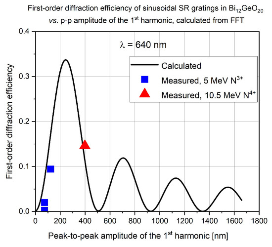 Moreover, optimizing the diffraction efficiency of such gratings is possible by first determining the optimum amplitude of the 1st harmonic from the Raman–Nath equation (Figure 9 and Figure 10), then determining the necessary implanted fluence from the 1st order harmonic amplitude vs. fluence curves (Figure 4, Figure 5, Figure 6, Figure 7 and Figure 8).