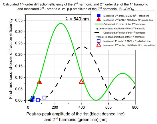 One of the main theses of this article was that the relatively large higher-order diffraction efficiencies of the ion beam-implanted gratings were due to the higher harmonics of the grating profiles. To check that thesis, both first-order diffraction efficiencies of the second harmonic and second-order diffraction efficiency of the first harmonic were calculated for a part of the gratings studied in this work. Results for gratings implanted in Bi12GeO20 are shown in Figure 11.