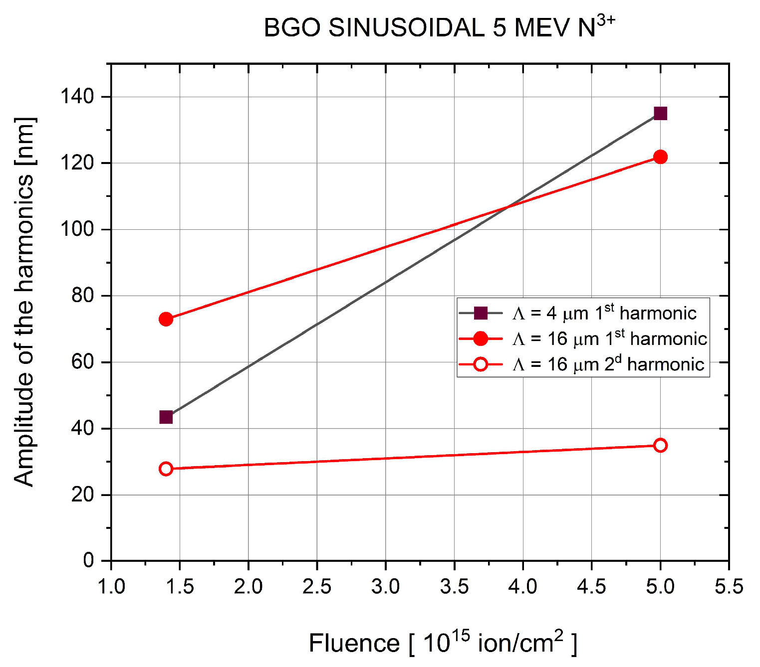 Sample Material | Grating Constant (Λ) [µm] | Implanted ion and Charge State | Ion Energy [MeV] | Current Density [10−3 A/cm2] | A1/A2 F = 1.0 × 1014 | A1/A2 F = 4 × 1014 | A1/A2 F = 1.4 × 1015 | A1/A2 F = 4 × 1015 | A1/A2 F = 7.5 × 1015 |