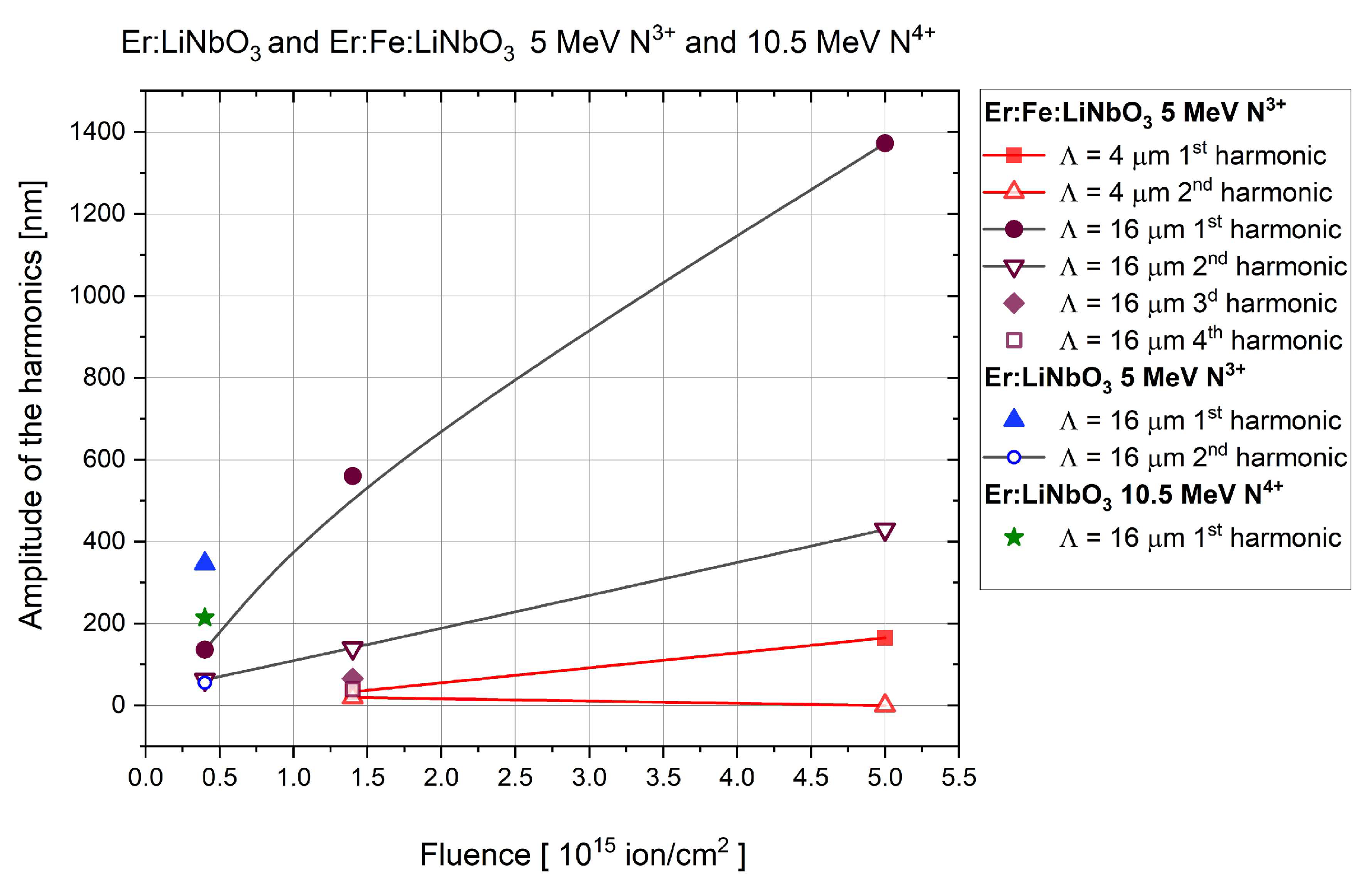GZ04 | Er:LiNbO3 crystal | N4+ | 10.5 | 4 × 4 | 1.0 | 4 × 1014 | 16 |