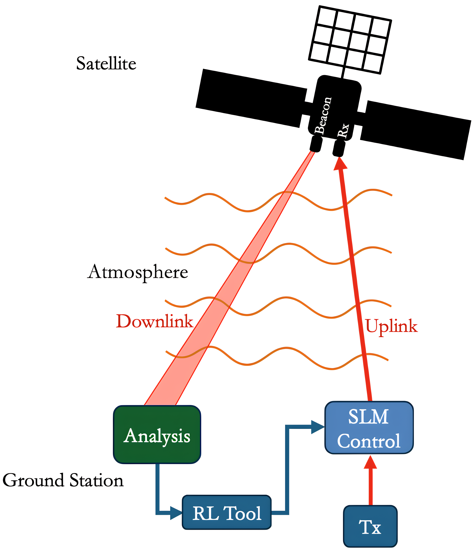 In this work, we build on these advances to develop an adaptive beam shaping system that uses reinforcement learning (RL) and beacon feedback to control an LCOS SLM. Unlike prior approaches that require channel modeling or calibration, our system learns directly from intensity measurements, enabling responsive adaptation to turbulence. We demonstrate that this method improves both the average received signal power and its temporal stability under dynamic free-space optical conditions. The advantage of incorporating an RL agent, rather than a traditional supervised deep neural network (DNN), is that RL optimizes the SLM phase directly from the receiver’s scalar reward; no labeled data is required. This makes RL naturally suitable for near-real-time adaptation to non-stationary turbulence. In contrast, a supervised DNN would require a large labeled dataset covering many turbulence states and could generalize poorly under distribution shifts. Updating such a model during deployment typically requires retraining.