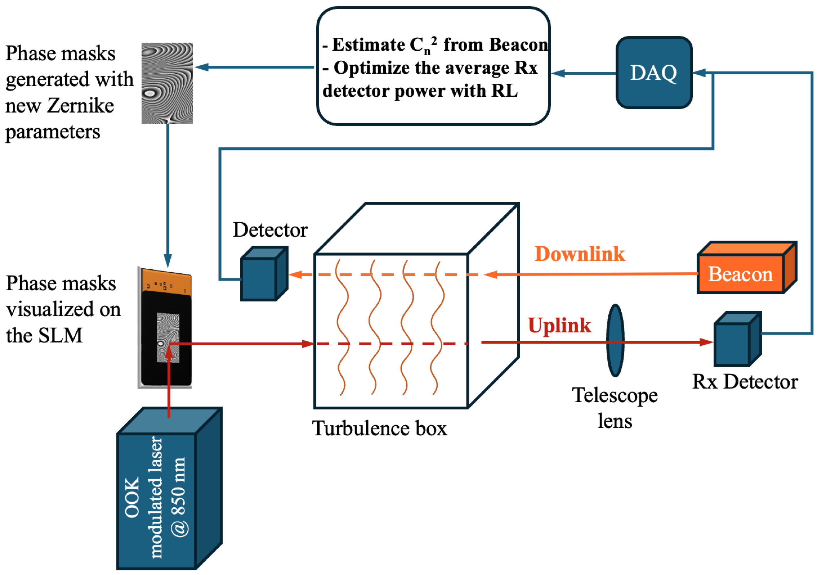 In parallel, a 660 nm beacon beam is propagated in the reverse direction to provide feedback on turbulence intensity. A Thorlabs DET210 photodetector placed near the uplink transmitter captures the returned beacon signal. These measurements are used to estimate the refractive index structure constant (), which is fed to the RL agent as part of the observation vector, offering contextual information about prevailing turbulence conditions.